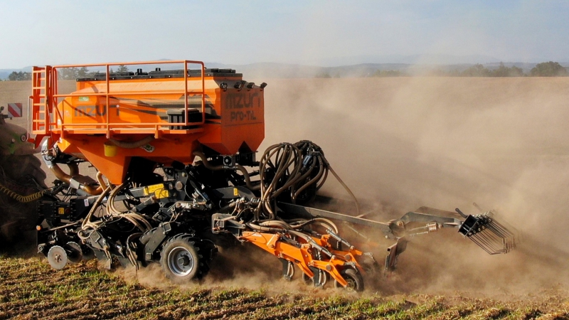 Secí stroj se zpracováním půdy Strip-Till, který umožňuje zpracování půdy, setí a hnojení v jednom přejezdu.