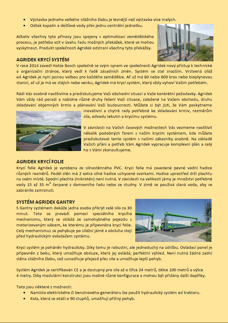 Kvalitní krmivo je klíčem k vyšší produkci mléka a zvýšení její ekonomiky. Vize společnosti Agridek si zakládá na tom, že toho může být dosaženo pomocí práce s vrstvenými (sendvič) silážemi. Je to nejúčinnější metoda, kterou lze použít. Agridek uvedl na trh několik inovativních systémů zakrývání silážních jam.